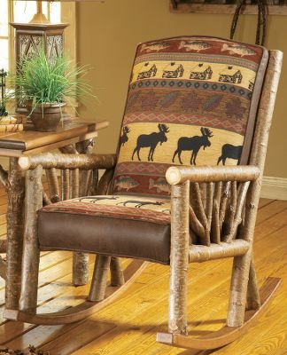 Bring the look of a vacation lodge to your home with this handcrafted, log-accented rocker. Handcrafted, authentic rustic poplar wood arms have a sunburst twig design. The fully upholstered seating area invites you to sit down in superb comfort. The patterned chenille fabric shows a bull moose, fish and forest leaves, all in nature-rich colors of tan, forest green, russet burgundy and black. Granite-colored, tweedlike chenille boxing fabric and chocolate brown faux leather for the body and contr