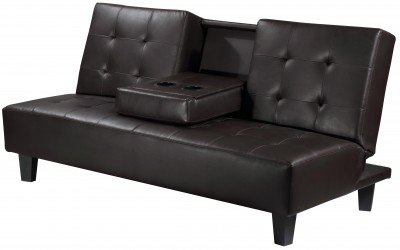 YG-L60-BRN Features: -Upholstery: Dark Brown vinyl coated faux leather.-Seat and back cushion made of high density foam, convoluted foam and polyester.-Flip down storage tray.-Hand stitched details with tufted design.-Plastic legs and steel mechanisms.-Legs located in zippered pouch underneath sofa. Construction: -Frame construction: Solid oak wood. Dimensions: -Dimensions: 35" H x 70.5" W x 37" D, 80 lbs.