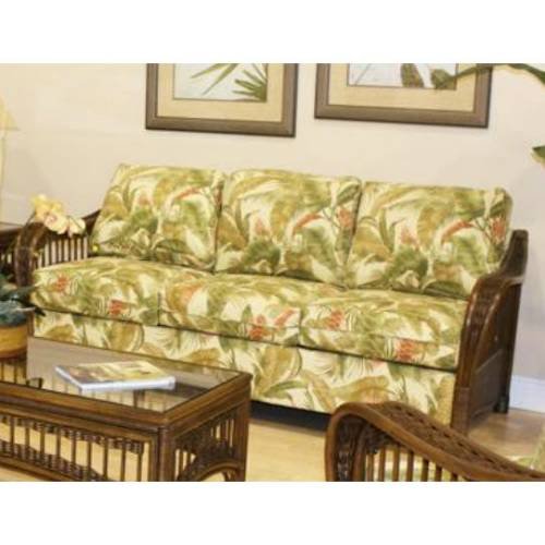 The St. Lucia upholstered rattan and wicker sofa is popular for casual home settings. It is reasonable, comfortable, and stylish. With the upholstered version incorporates fabric along the back of the sofa.Includes cushion with choice of fabric in a variety of colors and patterns Fully Assembled Woven wicker bindings Upholstery done in the USAAssembly Required: No Collection: St Lucia Country of Origin: Phillippines Depth: 35 Finish: Antique Height: 32 Material: Rattan Poles Woven Wicker Weight: