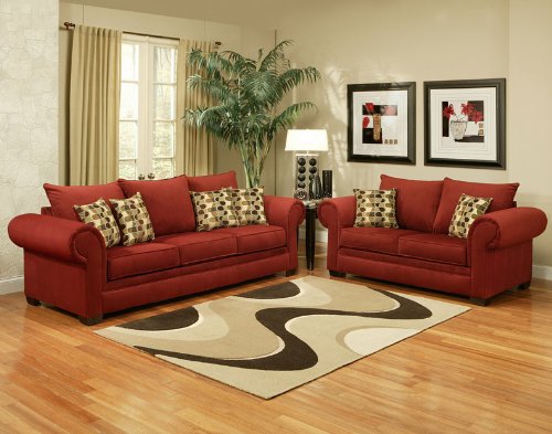 Sofa: 100"W x 37"D x 38"H, Loveseat: 75"W x 37" x 38"H, Chair: Optional, Available colors Berry, Material Fabric, Finished Wood finished legs, Price included 1 Sofa + 1 Loveseat + 1 Queen sleeper under sofa, Lead Time 7 days